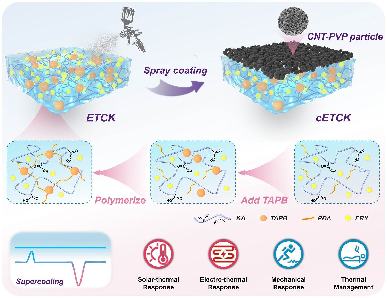 研究开发出柔性多能响应时空相变材料膜。 近日,中国科学院大连化学物理研究所研究员史全和副研究员寇艳团队开发出一种基于赤藓糖醇的多能响应柔性时空相变材料膜(cETCK)。该时空相变材料膜不仅可实现赤藓糖醇相变潜热在过冷状态下的长期存储与可控释放,还具备良好的柔韧性、机械性和多重能量响应特性,在可穿戴热管理领域展现出良好的应用潜力。相关成果发表在《化学工程杂志》。