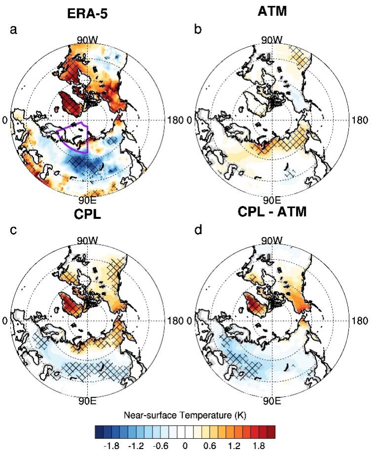 从ERA-5再分析资料(a)仅考虑大气过程的大气模式试验(b)包含海-气耦合过程的全耦合模式试验(c)得到的历史时期海冰消融导致冬季地表气温异常(d)全耦合模式试验与大气模式试验结果之差