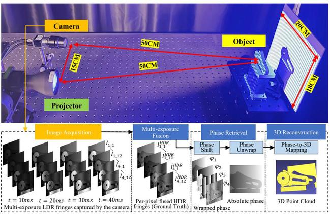 结构光三维重建技术广泛应用于智能制造、自动驾驶、人脸识别等领域。条纹投影轮廓测量作为主要的结构光3D重建技术之一,因其稳定性和高精度在工业和科研中得到了广泛应用。然而,条纹轮廓测量的前提是获取精准的调制图案,这一过程中,受到相机成像动态范围的限制,尤其是对于具有不同表面反射率的物体,重建效果往往不理想,极大地限制了其在复杂场景中的应用,特别是在工业零部件的测量中,传统的多次曝光图案合成方法效率低,难以满足快速和高精度的需求。