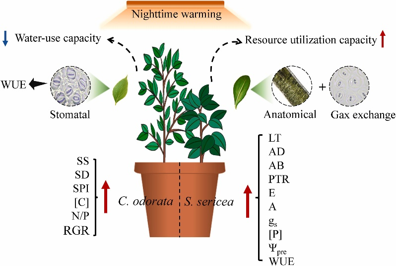 由不对称全球变暖引起的夜间增温主要表现为昼夜温差缩小。已有的研究认为夜间增温会刺激植物呼吸,导致碳净损失,对植物生长不利;然而,夜间增温对入侵植物的生理生态影响尚未明确。