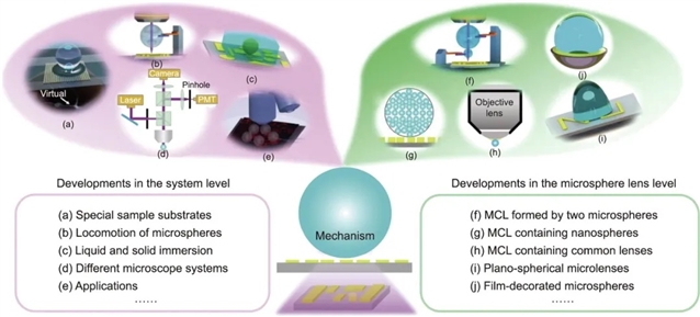图1 光学微球纳米成像的原理及其进展。这些进展可以分成两大类,即系统层面的发展[(a)~(e)]和微球透镜层面的发展[(f)~(j)]。