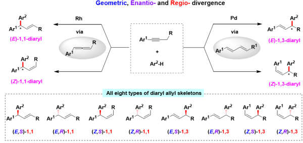 在课题组前期发展的一系列催化转化策略基础上,研究人员探讨内炔烃的发散性氢杂芳基化反应,开发出催化剂控制的区域、立体、几何三维可控合成策略,可同时制备出8种二芳基烯丙基骨架。