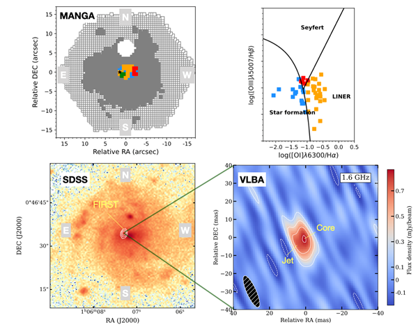 左上图为光学积分视场单元光谱图,右上图为对应像素的BPT诊断图,利用星系光谱里几条特定发射线的比例,来区分星系的电离源来自恒星形成和活动星系核的贡献。左下图为光学观测图与射电FIRST巡天观测等值线。右下图射电射电甚长基线干涉阵列VLBA观测到的核-喷流结构。