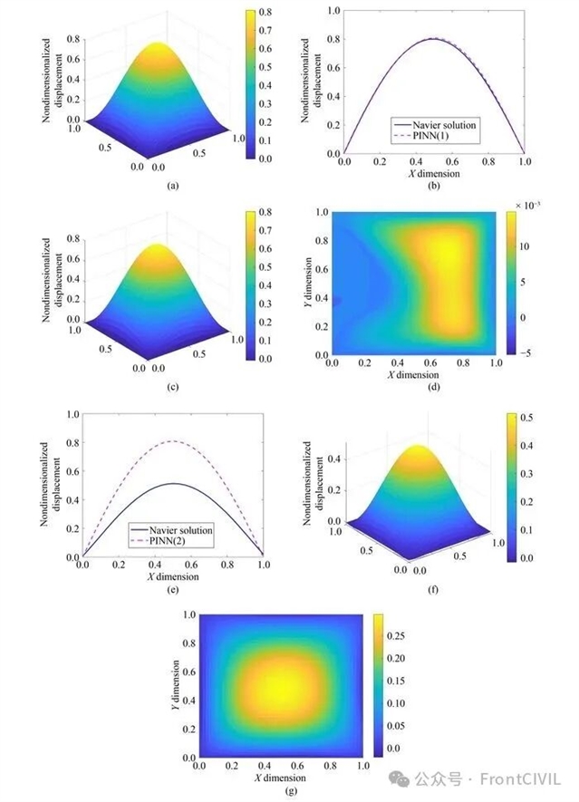 绝对无量纲位移:(a)为Navier解;(b)在板的中心线处使用PINN(1)模型;(c)使用PINN(1)模型在板的整个域;(d)使用PINN的误差谱(1)模型;(e)在板的中心线处使用PINN(2)模型;(f)使用PINN的整个板域(2)模型;(g)使用PINN(2)模型的误差谱