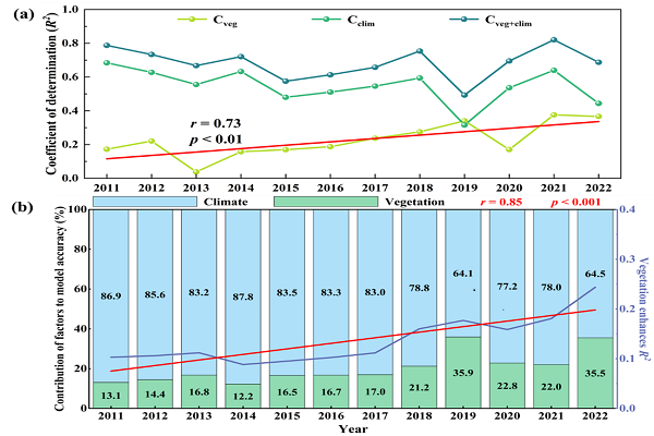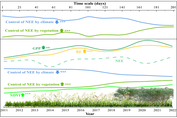 研究将环境因子划分为植被因子和气候因子,结合多元逐步回归与机器学习方法,从多时间尺度和不同恢复年限两个维度系统,评估了二者对修复湿地碳通量的相对贡献。结果表明,滨海湿地长达12年的自然恢复过程中,植被与气候因子共同决定生态系统的CO2净交换量(NEE)。随着时间尺度延长,气候因子为NEE年际变化的主要驱动因素,但植被对NEE变异的解释能力逐渐增强。年度尺度进一步分析表明,在基于气候因子的模型中引入植被因子,可显著提升模型解释力,且随着恢复年限增加,提升效应更为明显。这说明植被改善过程,在一定程度上减弱了气候因子对CO2封存能力的主导影响,从而增强了生态系统碳汇功能稳定性。