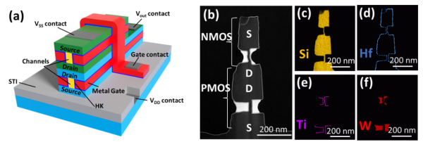 (a) 单片集成CVFET器件架构图; (b)单片集成CVFET器件的TEM截面图和(c-f)EDX元素分布图