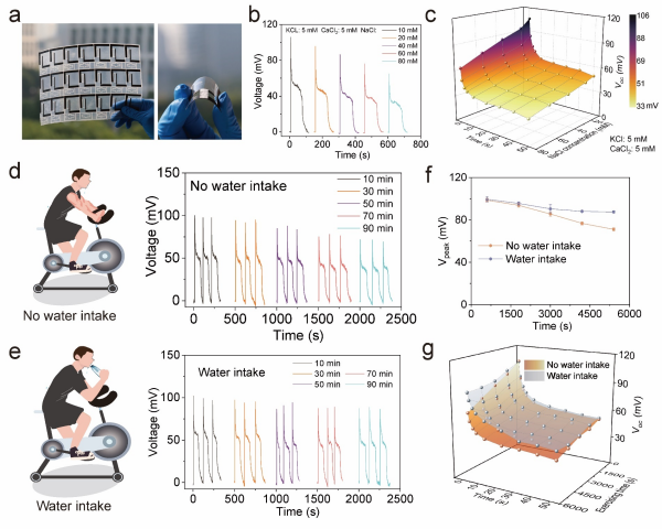 得益于该快速离子传输-累积机制,团队仅用3μL水滴便可在0.17s内产生超过4.0 V开路电压的突破性结果,其响应速度比已有报道快约两个数量级。该器件同时表现出宽范围的离子检测能力,并对NaCl盐溶液实现了高达-1.69V dec-1的灵敏度。水伏器件的离子传感信号是包含时间-离子浓度-电压的多维传感信号,通过时间切片处理可以实现高选择性离子传感,并且对运动过程中汗液电解质浓度变化进行准确监测。