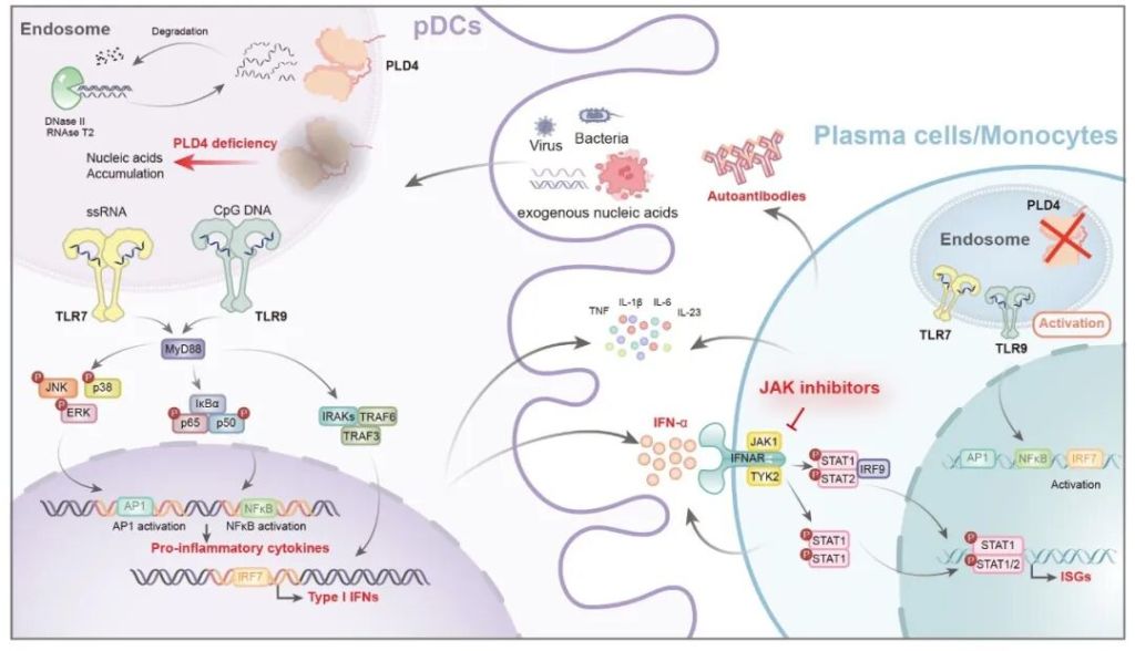 PLD4蛋白下游有两个蛋白TLR7和TLR9,它们参与了细胞中重要的免疫信号通路——I型干扰素信号通路。具体来说,TLR7和TLR9的角色是单链核酸的探测器,如果PLD4功能失活,未被降解的单链核酸就会累积起来,被TLR7和TLR9发现。过多的单链核酸对细胞来说是危险因素,它们有可能是外源的细菌或者病毒带入的,也有可能是从细胞核‘漏’出来的。当TLR7/TLR9感知探测到这些没有被降解的单链核酸,它们会向信号通路下游的分子传递警报,引导细胞产生I型干扰素等细胞因子,引发了一系列强烈的免疫反应。