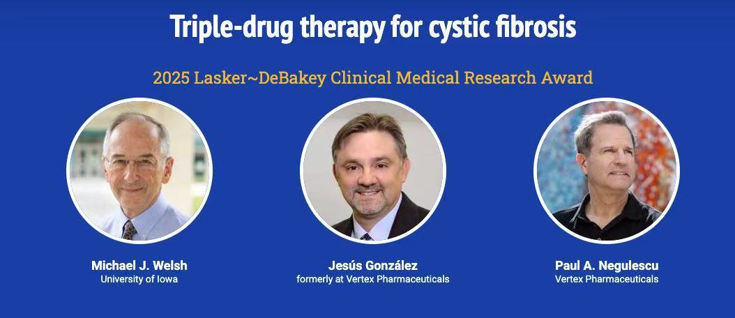 拉斯克临床医学研究奖授予了美国爱荷华大学的迈克尔·威尔士博士、曾任职于福泰制药的赫苏斯·冈萨雷斯博士,以及现任福泰制药科学家保罗·内古列斯库博士,以表彰他们在囊性纤维化创新疗法开发中的关键作用。三人共同推动的三联药物疗法Trikafta彻底改变了一种致命遗传病的治疗格局,使大多数患者的生活质量显著提升,预期寿命接近正常人水平。其中威尔士阐明了致病蛋白的功能机制,冈萨雷斯建立了高通量筛选系统,内古列斯库则主导了药物研发进程。三人的共同努力让这一曾致命的遗传病转变为“可控疾病”。