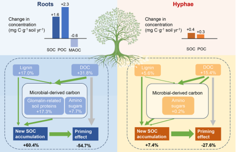 研究结果表明,根系对土壤有机碳的年均净贡献为1.2 mg C g-1土壤,是外延菌丝的近4倍。根系显著促进了新碳的固定,还可抑制原有有机碳的分解,从而实现土壤碳的净积累。根系输入主要促进颗粒有机碳的积累。