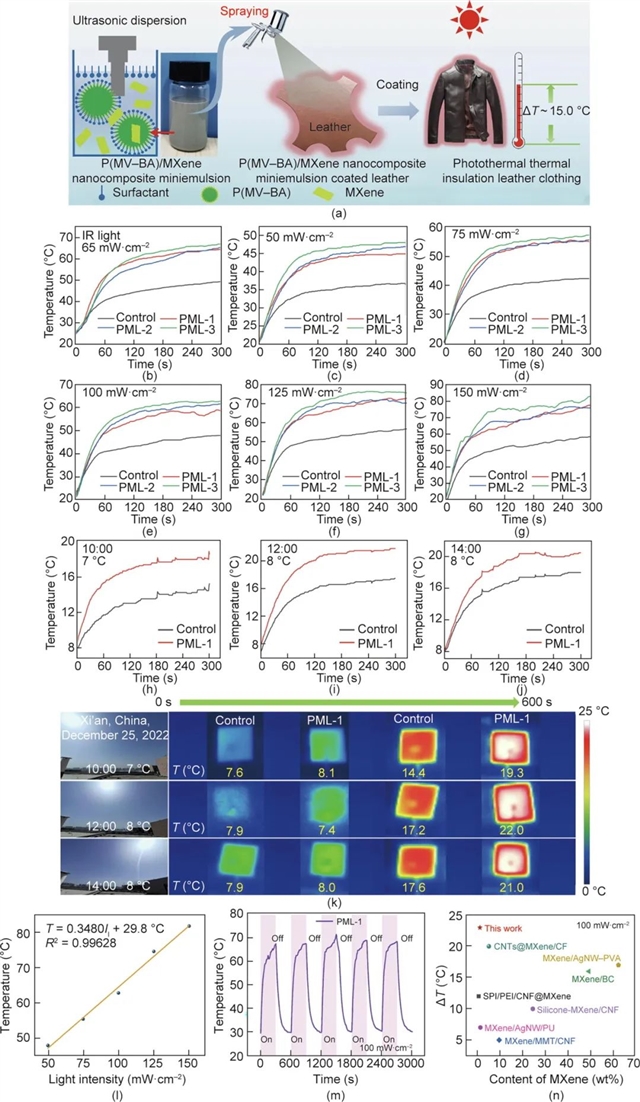 图3 (a)光热皮革服装的制备示意图。(b)在65 mW·cm-2红外光照射下P(MV-BA)/MXene纳米复合细乳液涂饰皮革(PML)的表面温度变化。(c)~(g)在不同光照强度的模拟日光下PML的表面温度变化:(c)50 mW·cm-2;(d)75 mW·cm-2;(e)100 mW·cm-2;(f)125 mW·cm-2;(g)150 mW·cm-2。(h)~(j)在太阳光下,同一天不同时段PML的表面温度变化:(h)10:00;(i)12:00;(j)14:00。(k)PML在太阳光下的红外图像(中国西安,2022年12月25日);(l)PML-1饱和温度与光功率密度的线性拟合曲线;(m)PML-1在5次循环开/关灯内表面温度的变化;(n)PMF与其他MXene基的光热薄膜在100 mW·cm-2模拟日光下的光热性能比较。PVA:聚乙烯醇;CF:纤维素落膜;MMT:蒙脱石;BC:细菌纤维素。