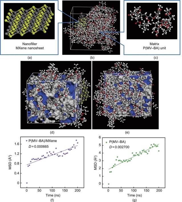 此外,MXene的引入还显著改善了皮革涂层的物理性能。分子动力学模拟显示,MXene与P(MV-BA)聚合物基体的结合能为32.898 kcal·mol-1,表明二者相容性良好。涂层自由体积分数从纯P(MV-BA)体系的13.11%提升至25.41%,透气性、透水汽性得到提升。热重分析显示,MXene的加入使涂层在270 ℃时的剩余质量增加3.81%,热稳定性也有所提升。