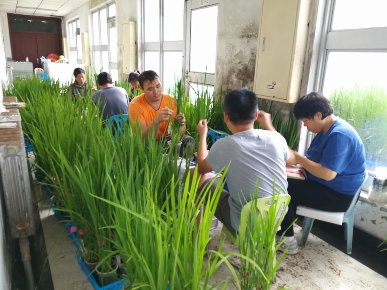 曹晓风(右一)、宋显伟(右二)、郭振华(右三)和课题组的学生们在测量叶枕距,了解水稻生长状态,并挂记录标牌。