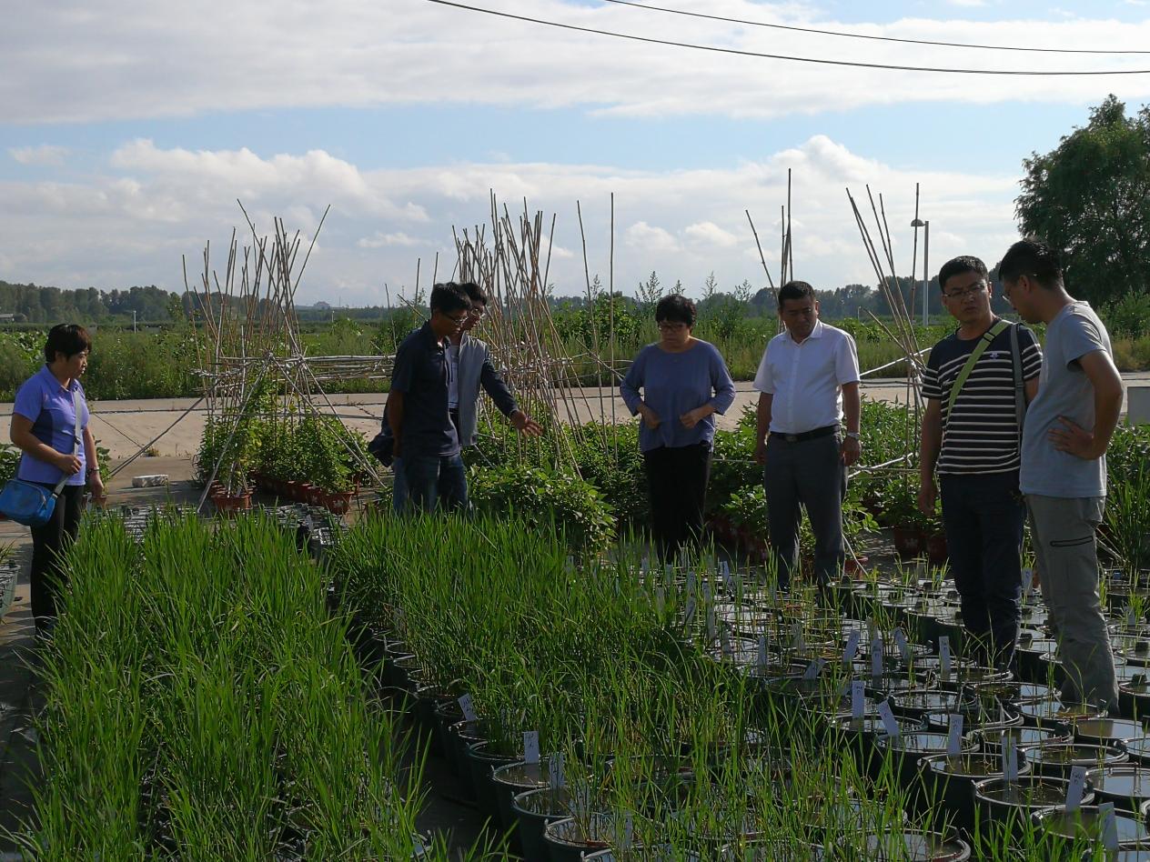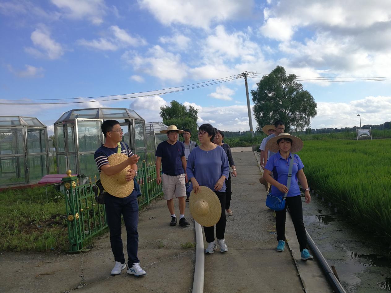 曹晓风(右四)与黑龙江省农业科学院耕作与栽培研究所所长李柱刚(右三)等在查看秧苗生长情况。