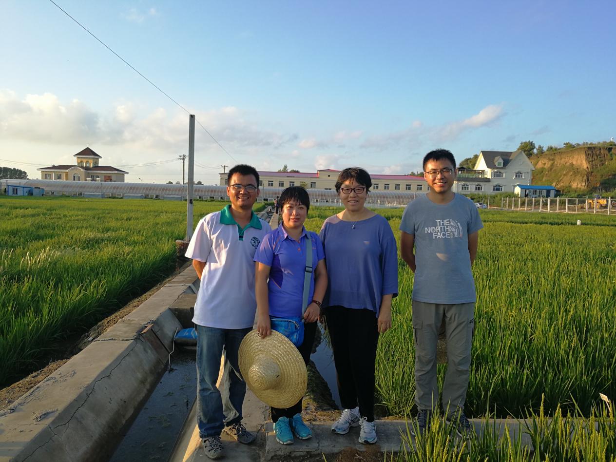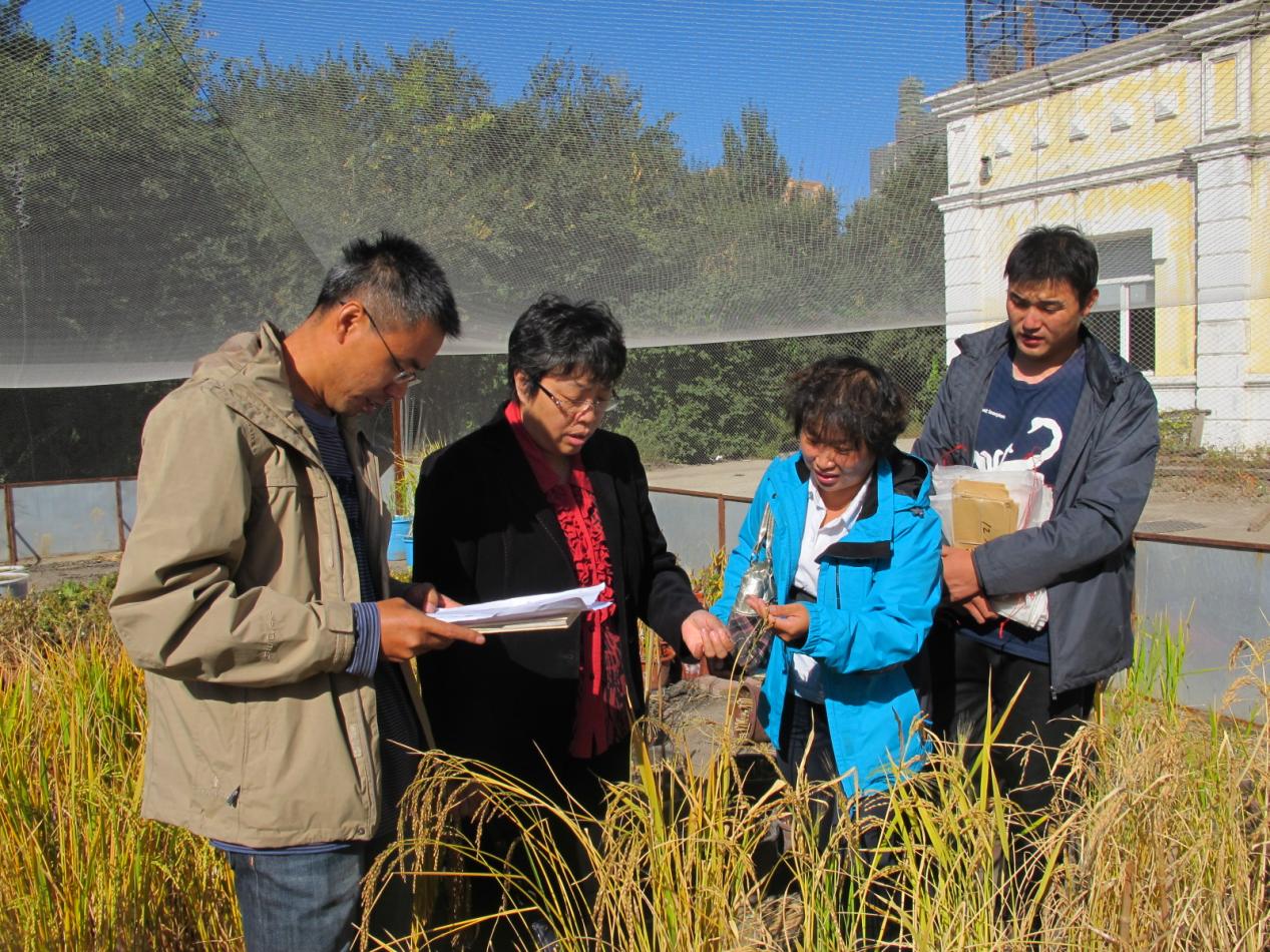 曹晓风(左二)、宋显伟(左一)、孟英(右二)、郭振华(右一)在查看水稻耐冷性品系结实情况。受访者供图