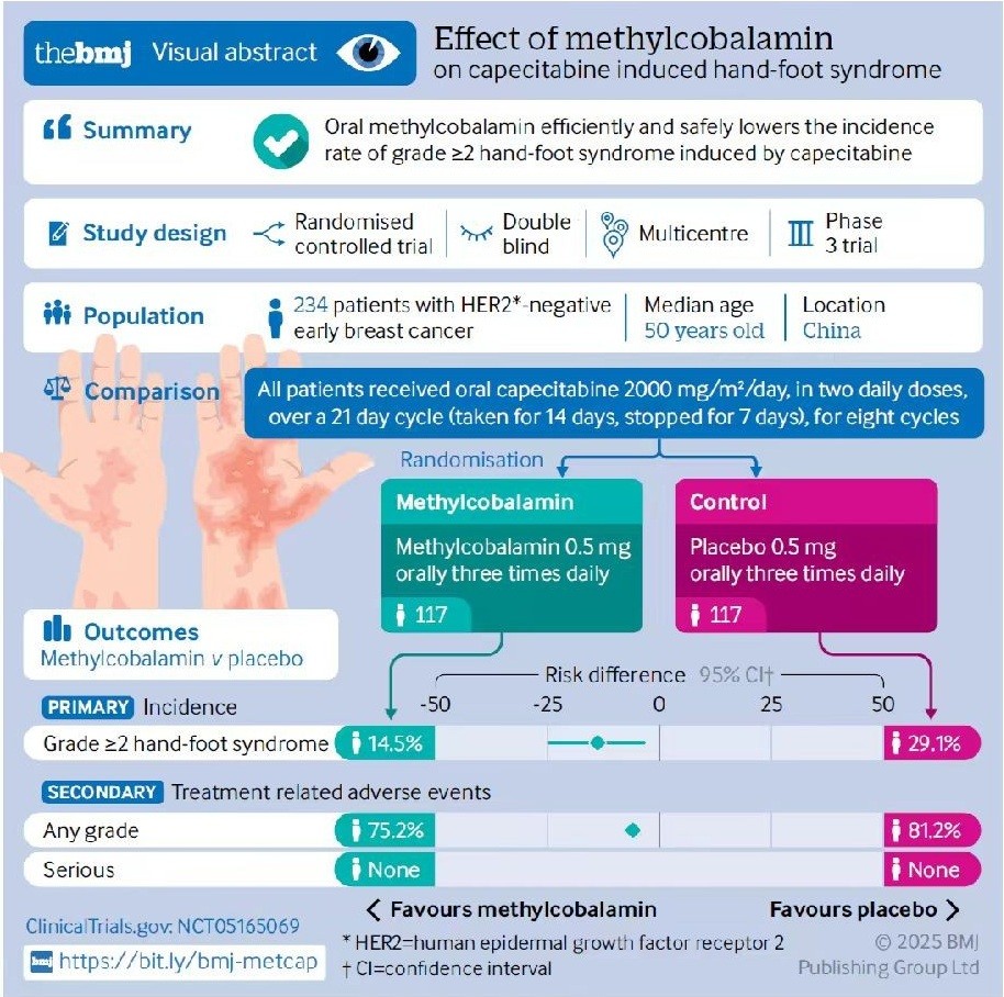 研究证实口服甲钴胺可防卡培他滨严重手足综合征。 中山大学孙逸仙纪念医院教授龚畅团队联合国内7家单位,开展多中心、随机、双盲、安慰剂对照的III期临床研究并证实:口服甲钴胺能显著降低HER2阴性早期乳腺癌患者接受卡培他滨辅助强化治疗时2/3级手足综合征的发生率,且未观察到特殊不良反应,为这类患者提供了有效且安全的手足综合征预防新方案。相关成果9月11日发表于《英国医学杂志》。