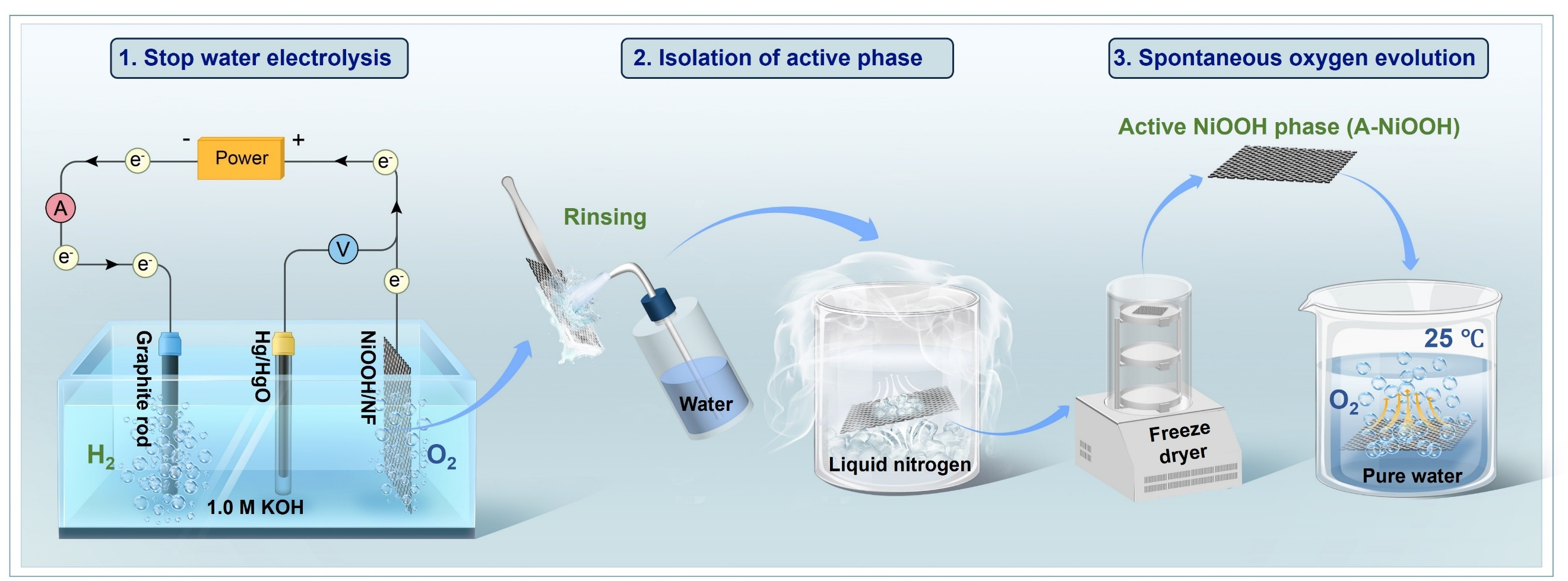 图1:工况电解水阳极NiOOH活性相的分离及自发放氧过程。