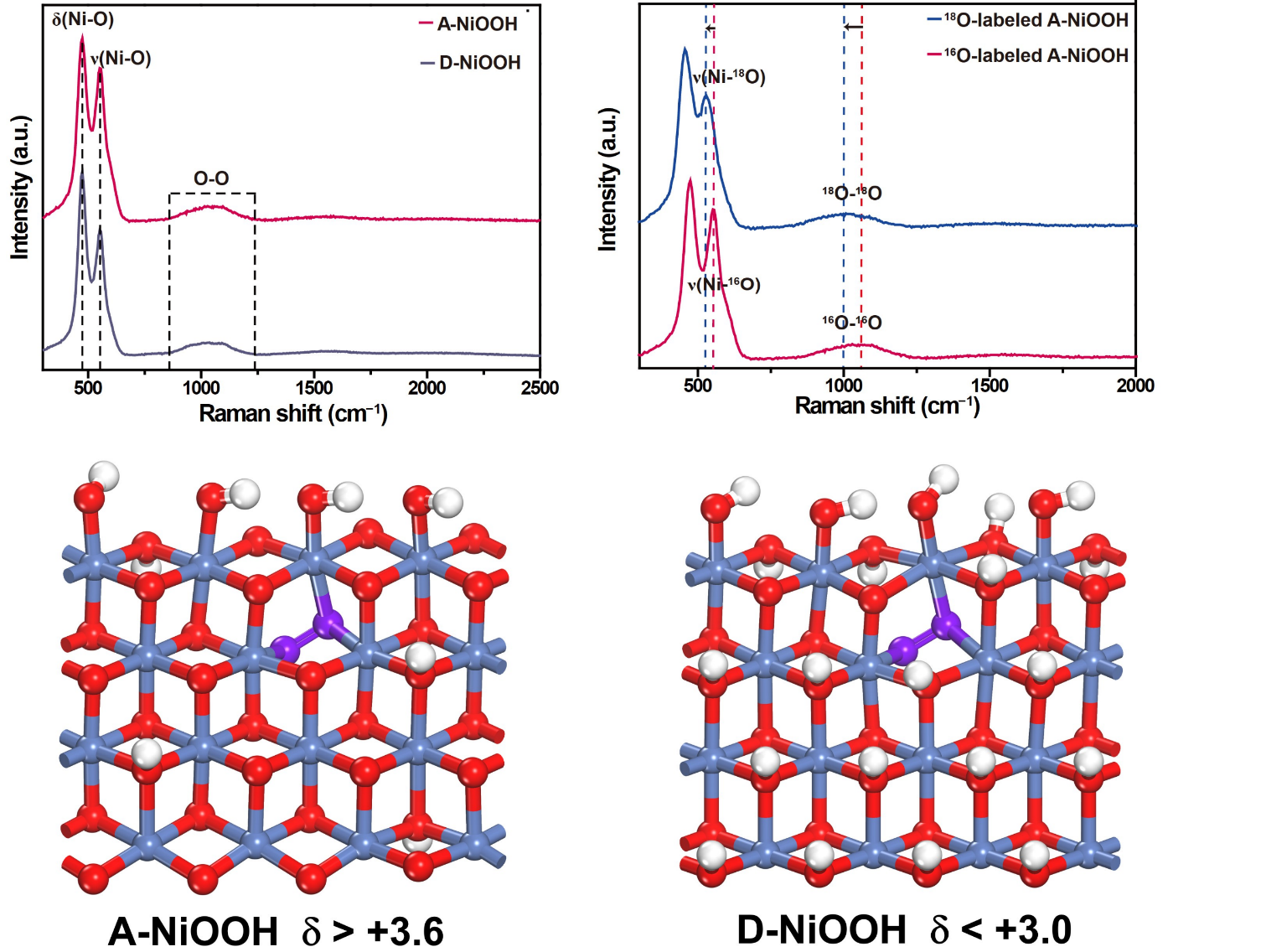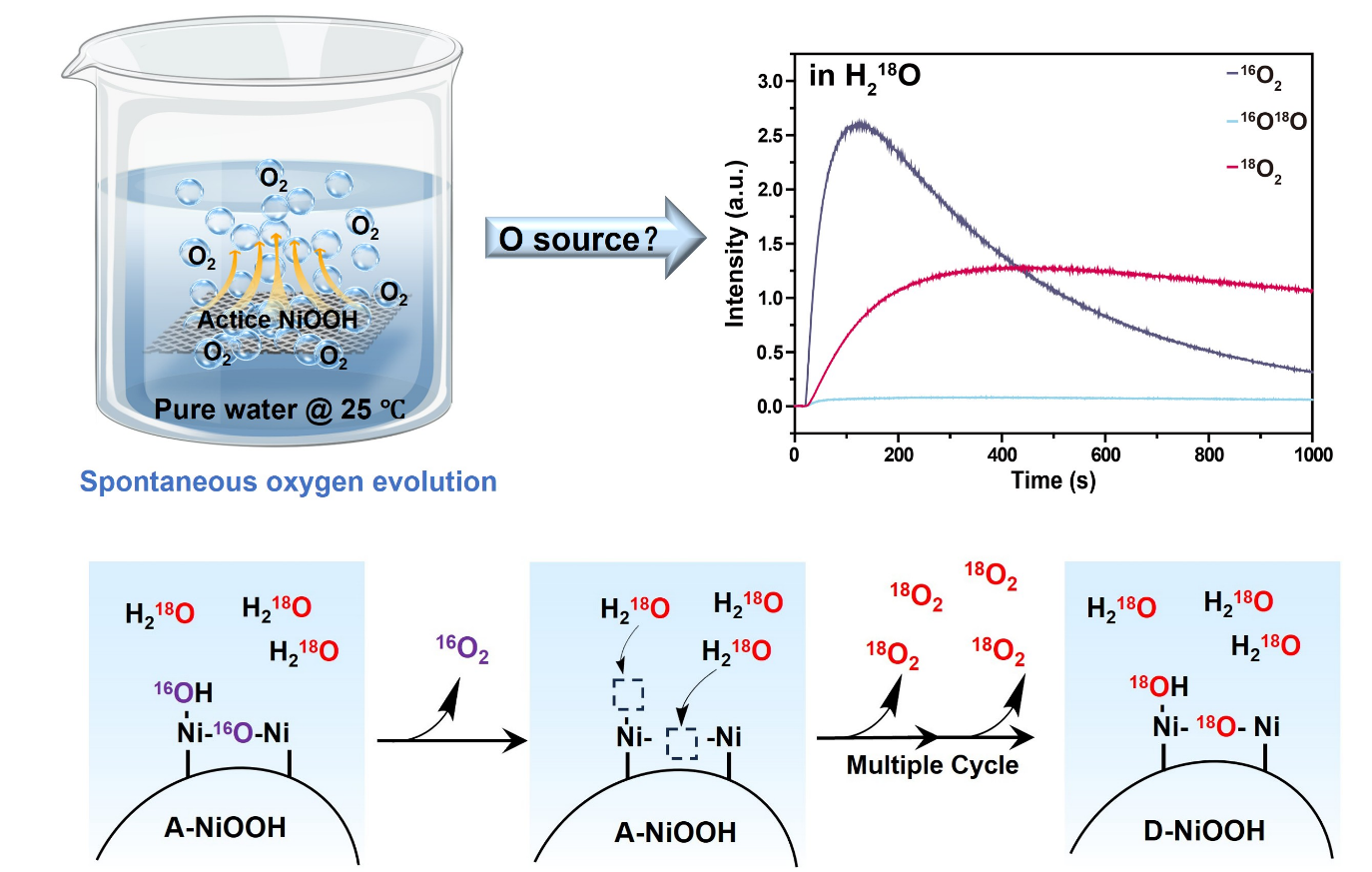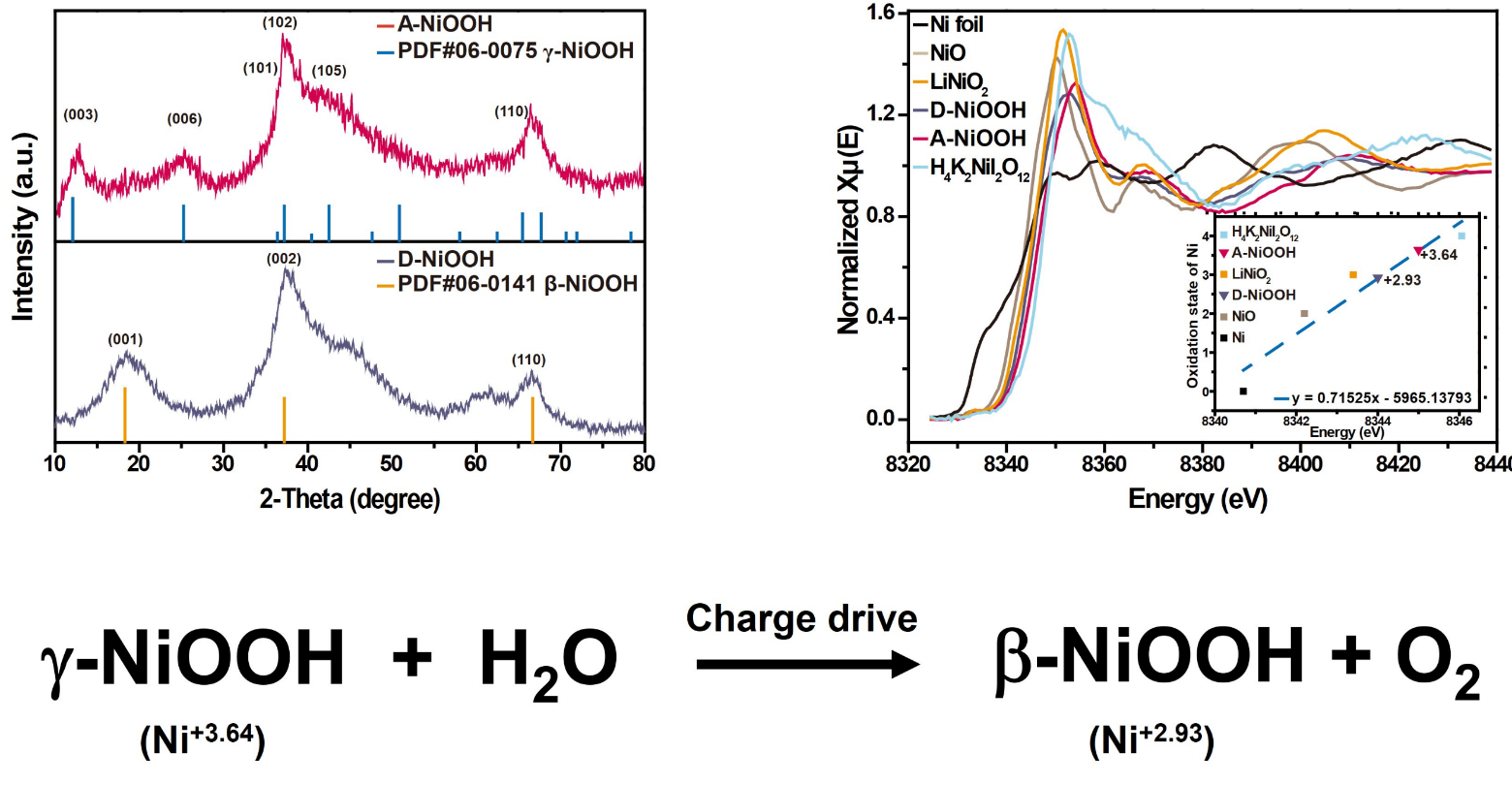 综合所有表征结果,研究团队结合计算模拟了具有稳定Ni-O-O-Ni2结构的A-NiOOH和D-NiOOH,并进一步确定了A-NiOOH与水反应生成D-NiOOH和氧气的结构反应式:A-NiOOH + H2O→D-NiOOH + O2。