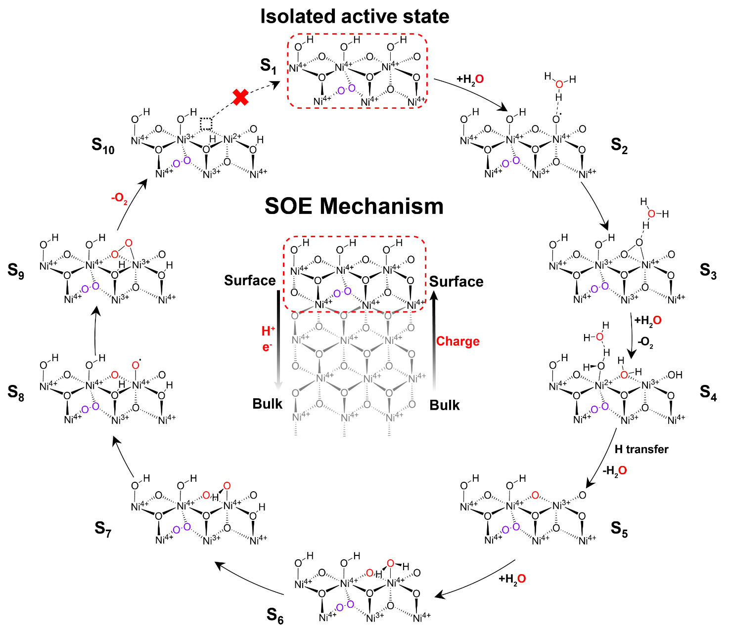 S5→S10:当表面积累足够多高价态Ni后,具备足够化学驱动力以氧化溶液中的水。在此过程中,吸附水分子上的氢转移至催化剂表面及体相内部,伴随氧自由基的形成和O-O键耦合,最终释放出18O2。若体相内高价态Ni充足,该循环将持续进行,直至高价态Ni耗尽。