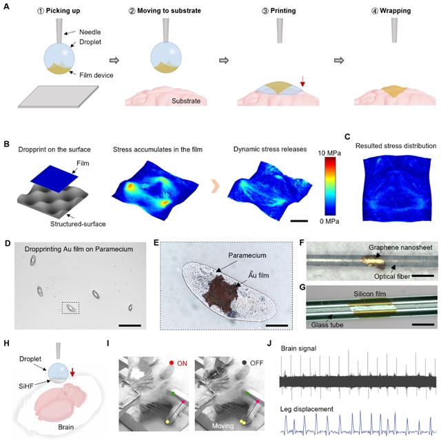 液滴打印实现薄膜的无应力保形贴附。(A)液滴打印的实施过程;(B)薄膜的动态应力释放过程;(C)薄膜中的应力分布;(D-E)在草履虫上打印的金薄膜;(F)打印在光纤上的石墨烯纳米片;(G)打印在玻璃管上的硅膜;(H-J)通过液滴打印在大鼠模型中构筑的脑机接口。