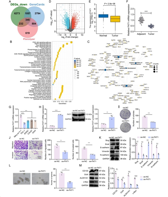 研究首先通过生物信息学分析锁定了关键分子。通过甲状腺癌相关的癌症基因组图谱(TCGA)数据,筛选出7907个低表达差异基因,并与GeneCards和Phenolyzer数据库中甲状腺癌相关基因取交集,获得345个候选基因。GO和KEGG富集分析显示,这些基因主要参与上皮细胞增殖、蛋白激酶B信号等通路。进一步结合基因表达相关性分析,发现FAT1基因在甲状腺癌组织和细胞系中显著低表达,且其过表达能抑制甲状腺癌细胞的克隆形成、迁移侵袭能力,减少上皮间质转化相关蛋白的表达,同时降低肿瘤干细胞标记物水平,提示FAT1可能是甲状腺癌的抑癌基因(图1)。