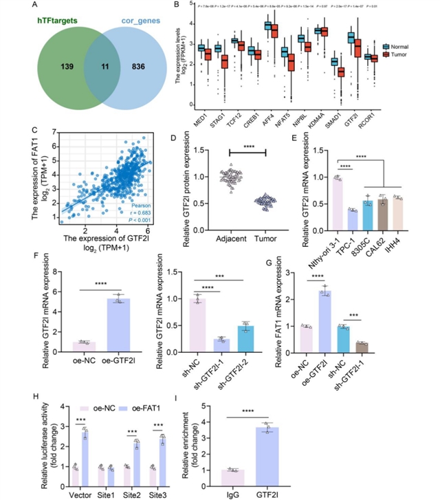 为探究FAT1的上游调控因子,研究通过hTFtarget数据库预测其启动子结合的转录因子,结合癌症基因组图谱数据中与FAT1表达正相关的基因,最终锁定了GTF2I。实验验证显示,GTF2I在甲状腺癌组织和细胞系中同样低表达,且其过表达能显著上调FAT1的mRNA和蛋白表达水平;双荧光素酶报告实验和染色质免疫共沉淀(ChIP)实验进一步证实,GTF2I可通过结合FAT1启动子区(主要是1243-1258位的TCCCCTCTGCCTAGGA位点)直接激活其转录(图2)。功能实验表明,GTF2I对甲状腺癌细胞恶性表型的抑制作用可被FAT1敲低逆转,说明GTF2I通过上调FAT1发挥抑癌功能。