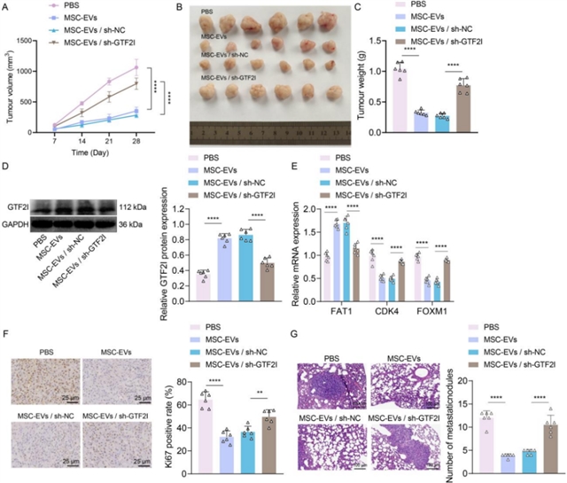进一步研究发现,细胞外囊泡传递的GTF2I通过上调FAT1,可显著降低CDK4和FOXM1的表达。CDK4和FOXM1在甲状腺癌中高表达,且CDK4过表达可逆转FAT1对甲状腺癌细胞恶性表型的抑制作用,提示FAT1通过下调CDK4/FOXM1发挥功能。体内实验中,骨髓间充质干细胞来源的细胞外囊泡(BMSC-EVs)处理的裸鼠移植瘤体积和重量显著减小,肺转移结节数量减少,而敲低细胞外囊泡来源的间充质干细胞(MSC)中的GTF2I后,上述抑瘤效应被削弱;肿瘤组织中FAT1表达升高、CDK4/FOXM1表达降低,Ki67阳性率(增殖标记)下降,进一步验证了GTF2I通过细胞外囊泡传递的抑癌作用(图3)。