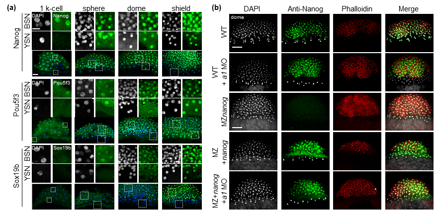 为了研究Nanog是如何调控早期胚胎YSL中的合子基因激活(ZGA)程序,科研团队进一步构建Nanog、Pou5f3和Sox19b等3个先锋因子编码基因的敲入品系,用于示踪3个先锋因子在早期胚胎发育过程中的动态变化。研究发现,Nanog持续激活YSL核中cyp11a1的转录和P5的合成,从而促进胚外组织中的微管组装、胚胎外包运动,以及Nanog、Pou5f3和Sox19b等先锋因子向YSL核内的运输和聚集,有效激活了YSL细胞中依赖于Nanog-cyp11a1-P5轴的ZGA和功能性YSL形成,并诱导中内胚层的发育。