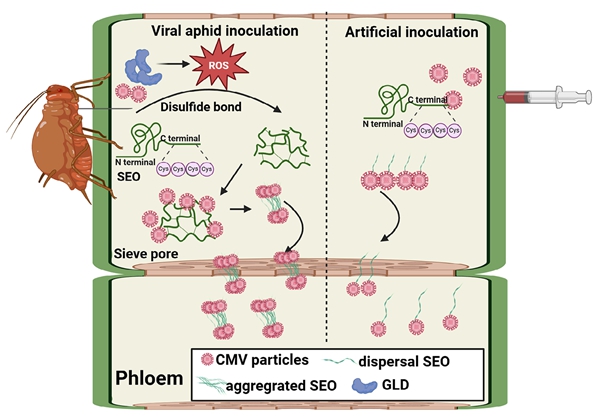 研究表明,桃蚜在取食为害时,会大量分泌一种关键的唾液效应蛋白——葡萄糖脱氢酶(GLD)进入植物维管系统的韧皮部。通过氧化还原作用,在韧皮部筛管内形成氧化性的微环境,促进筛管阻塞蛋白(SEO)C-末端保守的半胱氨酸残基之间形成分子间二硫键,并协同其N-末端的内在无序区驱动SEO蛋白,由分散状态转变为高度有序的聚合结构。