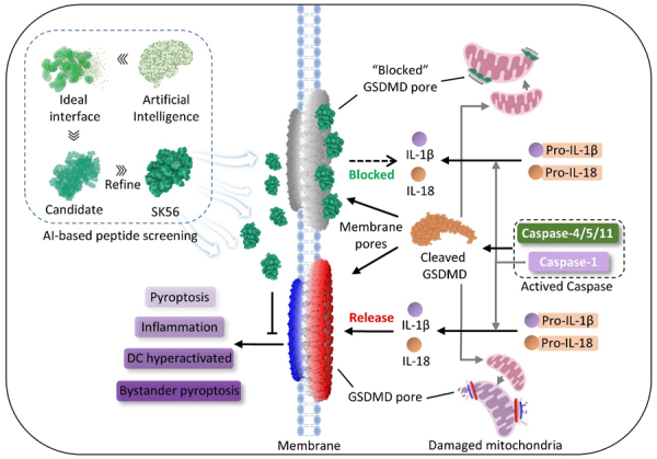 SK56为精准治疗炎症驱动性疾病,如脓毒症、慢性炎症和自身免疫性疾病,提供了新的候选药物。SK56能够在焦亡反应开始后阻断孔道并保护免疫功能,有望重新定义相关疾病的治疗策略。该研究还展示了人工智能引导的肽类设计,在靶向“不可成药”生物结构中的潜力,为生物药物开发开辟了新途径。尽管研究数据提供了有力的机制解析,但实验模型尚未完全模拟自然感染的复杂性,尤其是系统性免疫调控环境。未来,研究团队将进一步探索SK56在自然感染或创伤模型中的效果,研究其治疗窗口及与现有抗炎药物的协同作用,并阐明SK56与GSDMD相互作用的结构基础。