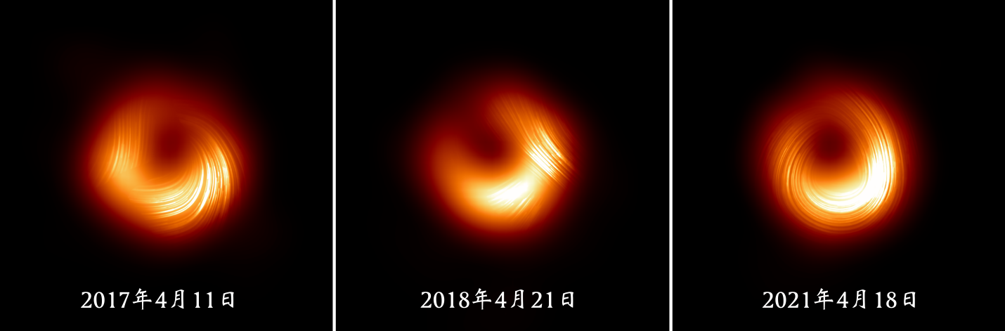 此次研究发现,2017年至2021年间,M87*环的大小保持一致,证实了爱因斯坦广义相对论预言的黑洞阴影。但4年间,M87*环的偏振模式发生了显著变化,2017年磁场分布由里向外呈逆时针方向,2018年相对稳定,而到2021年则完全反转成顺时针方向。