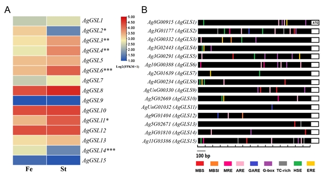图2. (A) 芹菜AgGSL家族基因表达量情况 (B) 芹菜AgGSL家族基因启动子中顺式作用元件分析。
