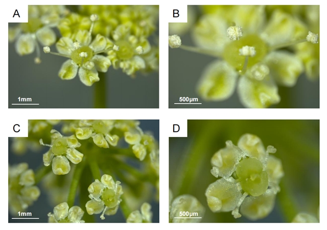 图1. 芹菜正常可育花与雄性不育花开放状态。注:A、B为可育花药,C、D为不育花药。