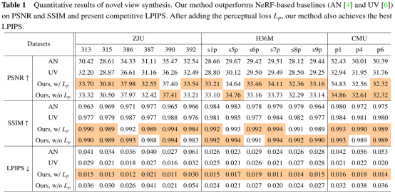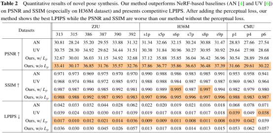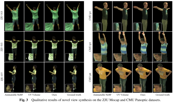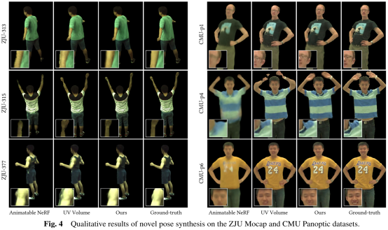 新视角与新姿态合成的定量与定性试验验证了本研究提出的可动3D高斯表示方式能够捕获更多细节,生成更真实可信的结果,同时具有更优越的渲染性能。
