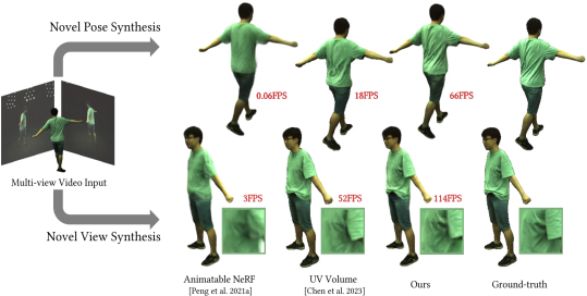 现有的合成人体动画的方法有着无法捕获复杂几何细节,或是计算开销过大的缺点。本文提出了一个全新的可动3D高斯表达,可用于实时合成新视角、新姿态下的高保真度人体视频。