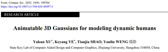 Yukun XU, Keyang YE, Tianjia SHAO, Yanlin WENG. Animatable 3D Gaussians for modeling dynamic humans. Front. Comput. Sci., 2025, 19(9): 199704