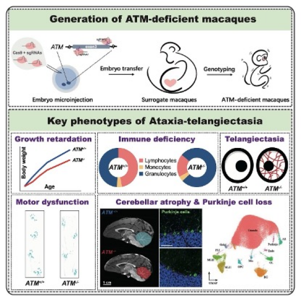 研究建立模拟人类神经退行性疾病A-T的非人灵长类模型。小儿共济失调-毛细血管扩张症(A-T)是一种由ATM基因突变引起的严重遗传性神经退行性疾病,虽然发病率极低,但其残酷的病程和无法治愈的现实,让无数家庭陷入绝望。截至目前,A-T没有有效的治疗方法,医生只能通过对症治疗来延缓病情。