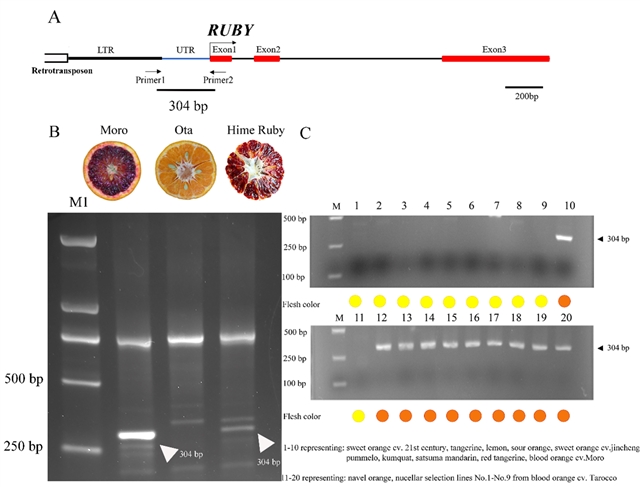 设计一对上、下游引物序列 (FanFan/XiXi) 特异扩增了柑橘叶片DNA中Ruby (从第1外显子起始密码子ATG上游551 bp开始启动转录) 的位点上游一段全长304 bp序列,通过扩增特定大小的DNA片段来快速鉴定柑橘类水果中具有花青苷积累的红色果肉性状 (图3A)。一种亲本太田椪柑嫁接在亲本摩洛血橙上,发生嵌合体变异并且筛选获得子代媛红椪柑,只在具有红肉性状的亲本摩洛与嵌合体子代媛红中扩增出一条全长304 bp的DNA片段,然而黄肉性状亲本太田椪柑没有这条特异大小的DNA扩增条带 (图3B)。