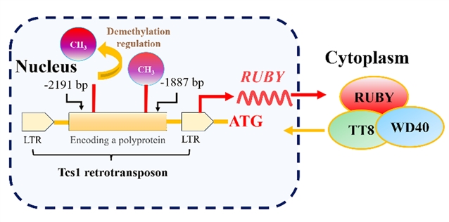 研究团队发现具有较高花青苷含量的血橙品种的果实汁胞细胞中转录因子Ruby和TT8的mRNA水平上调。与之比较,低花青苷含量的血橙品种中上述关键基因下调表达。此外,利用蛋白质双向电泳和质谱技术对这两个不同花青苷含量的品种进行比较分析,在汁胞细胞中没有发现花青苷生物合成与调控相关的差异表达蛋白。拟南芥中过表达血橙Ruby转基因植株与野生型对照相比较,转基因植株中不同组织的花青苷含量显著提高。同时,构建Ruby上游DNA区域中插入的逆转座子的长末端重复 (LTR) 序列融合表达GUS蛋白,经过转基因幼苗的组织化学染色,表明了LTR序列具有驱动GUS基因表达的能力。