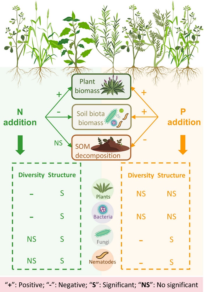 氮添加显著降低了植物与细菌群落及功能群水平的丰富度,改变了植物及所有土壤生物群落组成;磷添加则仅降低了真菌与线虫的多样性,影响了真菌与线虫群落结构。