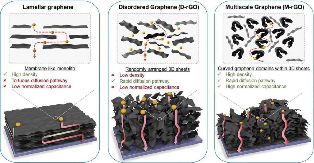 这项突破的核心在于一种名为“多尺度还原氧化石墨烯”的新型材料结构。研究团队使用澳大利亚丰富的天然石墨,通过快速热退火工艺,形成了一种高度弯曲的石墨烯结构,为离子提供了高效迁移的路径,最终使材料同时具备高功率和高能量密度——这一组合在单一器件中极为罕见。