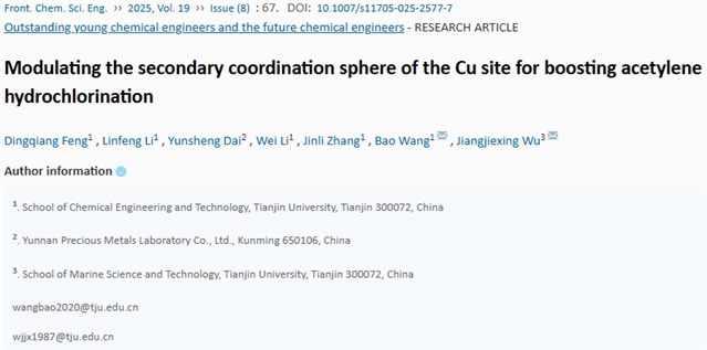FCSE 前沿研究:调控铜位点的次级配位环境以促进乙炔氢氯化反应。论文标题:Modulating the secondary coordination sphere of the Cu site for boosting acetylene hydrochlorination