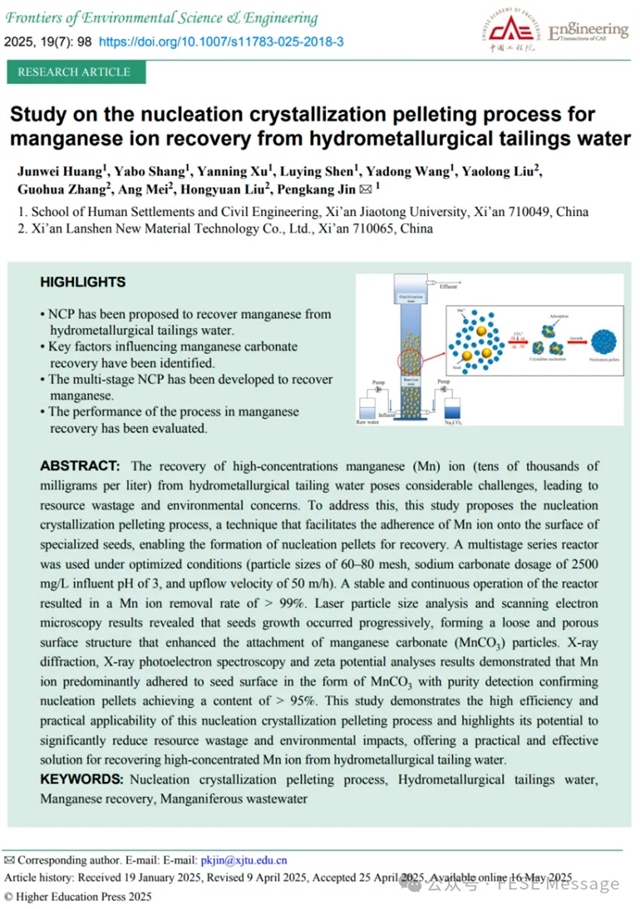 本文内容来自FESE期刊2025年第19卷第7期发表的研究文章Study on the nucleation crystallization pelleting process for manganese ion recovery from hydrometallurgical tailings water。通讯作者为西安交通大学人居环境与土木工程学院金鹏康教授。