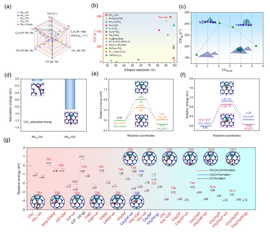 近期,研究团队创制了具有单团簇结构的RhSC/CN催化剂,克服了纳米颗粒催化剂活性金属原子利用率较低,以及单原子催化剂反应效率不高等问题,提升了二氧化碳加氢制乙醇的选择性和乙醇产率。研究发现,这一催化剂的活性金属以单团簇形式存在,具有近原子级分散度和对反应物分子较强的吸附活化能力。反应条件经过优化后,催化剂展现出最高的乙醇选择性和乙醇产率,分别为95.3%和17.5 mmol/gcat/h,其上转换频率TOF值达595.2 h⁻1。原位红外表征证实,该催化剂特有的单团簇结构,可促进碳碳偶联反应和关键中间体生成。理论计算显示,催化剂单团簇活性位上CH3*和CO*反应中间体进行碳碳偶联,具有最低的反应能垒,并揭示了乙醇生成的最优反应路径。
