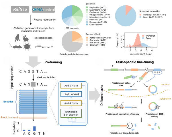 近日,中国科学院上海营养与健康研究所研究员张国庆联合南方科技大学讲席教授王泽峰团队,构建出基于深度神经网络的预训练模型,可微调预测pre-mRNA剪接位点、mRNA翻译效率、mRNA降解率和内部核糖体进入位点(IRES)等RNA调控相关的下游任务,揭示了RNA中调控元件的序列特征,鉴定出新型翻译调控元件,为探讨RNA调控机制和优化RNA生物医学应用提供了新工具和新思路。