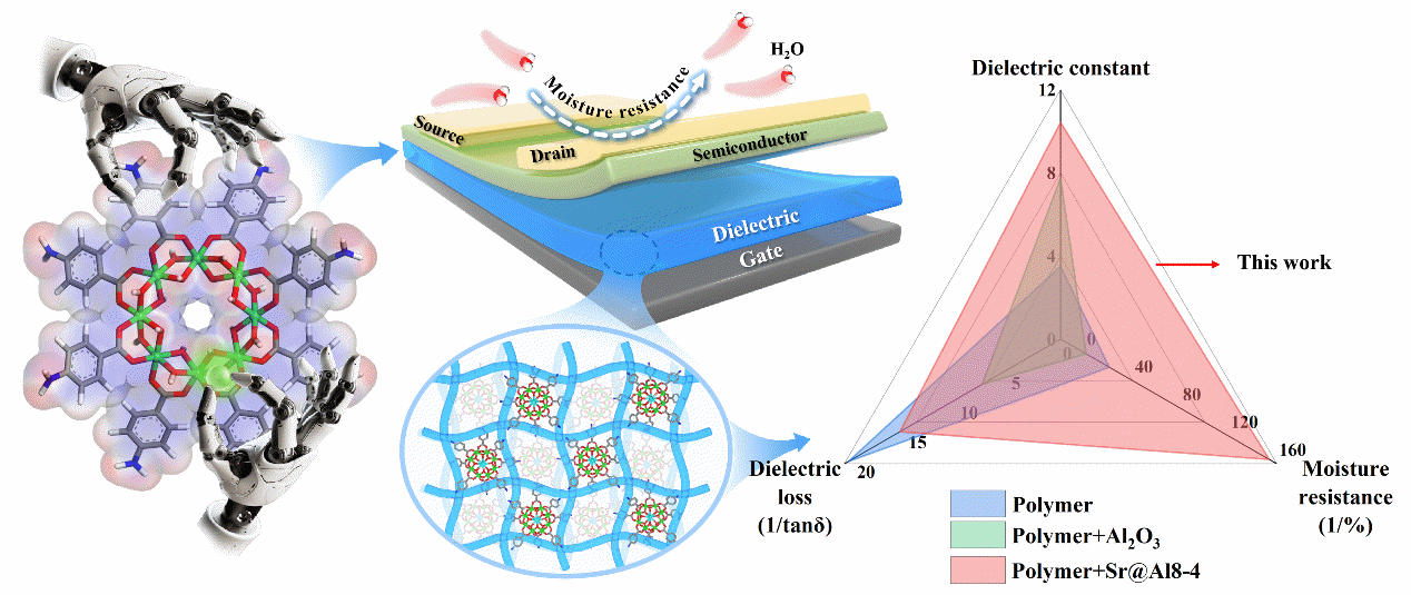高介电常数、低损耗和强耐湿性电介质研究获进展。场效应晶体管是微电子技术的核心。构建具有高介电常数、低介电损耗和良好环境稳定性的聚合物复合介电材料,对于提升场效应晶体管的性能和可靠性至关重要。但是,传统的高介电常数掺杂材料,存在界面粗糙、易团聚、兼容性不足、损耗高和湿度敏感等问题。同时,由此产生的器件吸湿效应会导致介电性能不稳定,阻碍聚合物复合界面上载流子运输机制的理论研究。