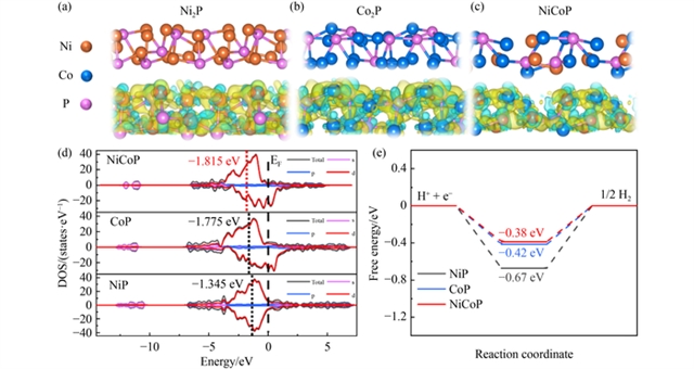 为揭示催化机制,研究结合密度泛函理论(DFT)计算,发现NiCoP的d带中心与费米能级的距离大于Ni2P和Co2P,表明其对氢中间体(H*)的吸附能垒更低。计算的H吸附吉布斯自由能(ΔGH*)显示,NiCoP的ΔGH*为-0.38 eV,接近HER的最佳值(0 eV),显著优于Ni2P(-0.42 eV)和Co2P(-0.67 eV),证明双金属协同作用有效调控了反应动力学。