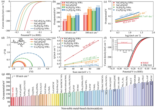 电化学性能测试表明,NiCoP@Ag NWs在0.5 mol/L H2SO4中表现出优异的HER活性:10 mA/cm2电流密度下过电位仅为109 mV,低于Ni2P@Ag NWs(144 mV)和Co2P@Ag NWs(174 mV);塔菲尔斜率为62.6 mV/dec,表明反应遵循Heyrovsky机制。交流阻抗谱(EIS)显示其电荷转移电阻远低于NiCoP@泡沫镍,证明Ag NWs导电网络可加速电子的传输。稳定性测试中,该催化剂在10 mA/cm2下连续运行100小时后,过电位仅增加6 mV,且核壳结构未发生明显降解。