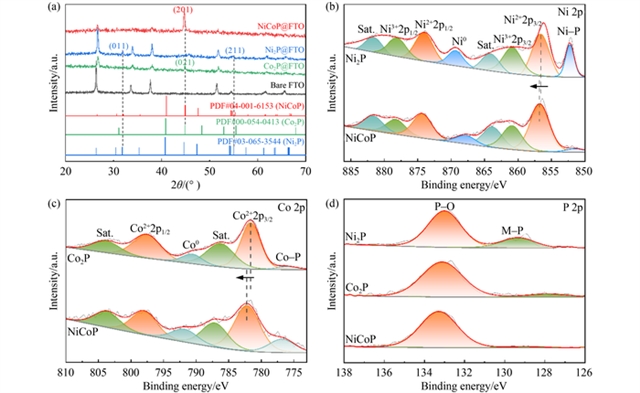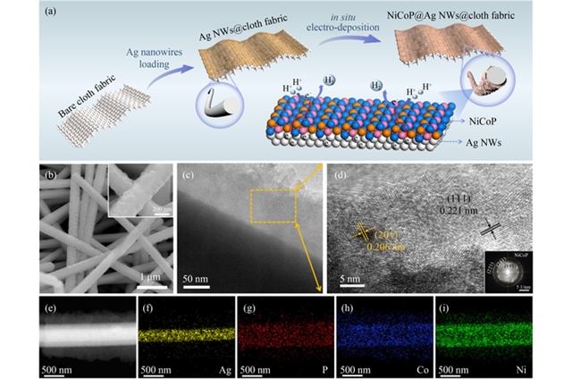 研究采用两步法合成了NiCoP@Ag NWs催化剂:首先通过水热法制备银纳米线(Ag NWs),并将其均匀涂覆在柔性布基底上形成导电网络;随后通过电沉积工艺在Ag NWs表面原位生长NiCoP,构建核壳结构。扫描电子显微镜(SEM)和高分辨率透射电子显微镜(HRTEM)表征显示,NiCoP均匀包覆于Ag NWs表面,形成粗糙的纳米突起结构,暴露出丰富的催化活性位点。X射线衍射(XRD)结果证实了NiCoP的(201)和(111)晶面存在,而X射线光电子能谱(XPS)分析表明,Ni、Co与P之间的电子相互作用导致了电荷的重分布,优化了催化剂表面的电子结构。