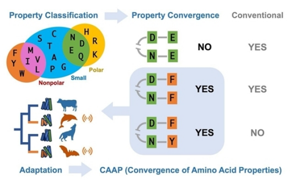 在演化生物学中,趋同演化是指不同生物类群在相似环境压力下独立演化出同一性状的现象。为了挖掘适应性演化的分子基础,比较基因组学研究聚焦于氨基酸状态趋同。但是,氨基酸之间的理化性质差异有大有小,不同氨基酸若具有相似理化性质,也可能实现相似的蛋白功能。因此,传统仅关注状态趋同的方法可能忽略了这一类重要的适应性趋同信号。